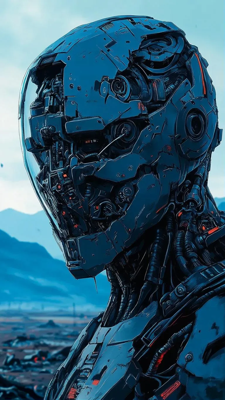Generate cyberpunk AI art with SCI_FACTOR_CORE: Android humanoid robot with open cyborg mask revealing mechanical parts, set in a vast battlefield against mountainous terrain. Explore ckgr-style concept art and digital effects for professional-grade visuals using vivago.ai's AI tools.