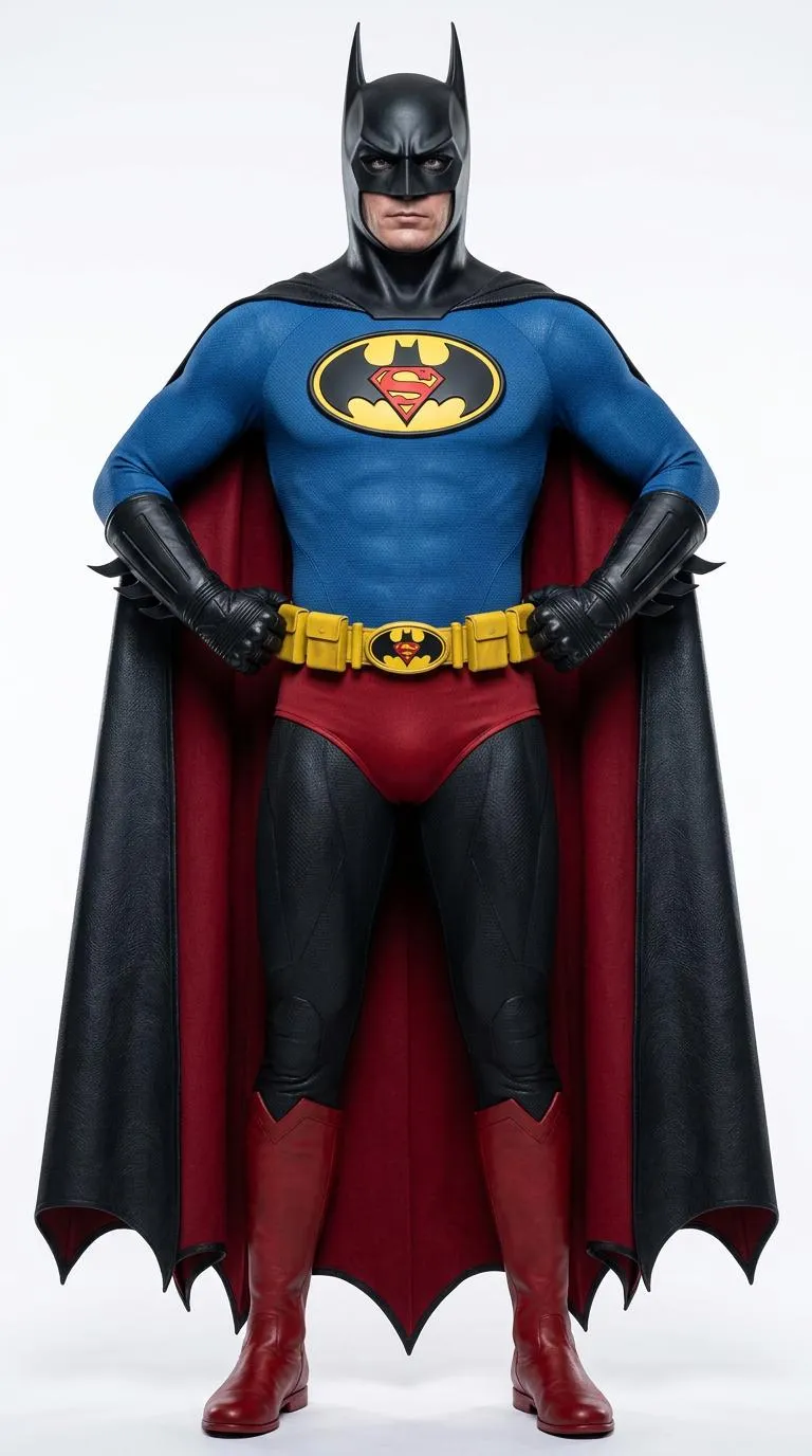 Create your unique Superbat fusion AI art! Generate Christopher Reeve/Routh Superman combined with Keaton/Kilmer/Clooney Batman. Features a hybrid suit with Batman's mask, Superman's blue shirt & hybrid Superbat logo, mixed belts, dual-color cape with bat-wing trims. Visualize this iconic DC superhero mashup with AI image generation.