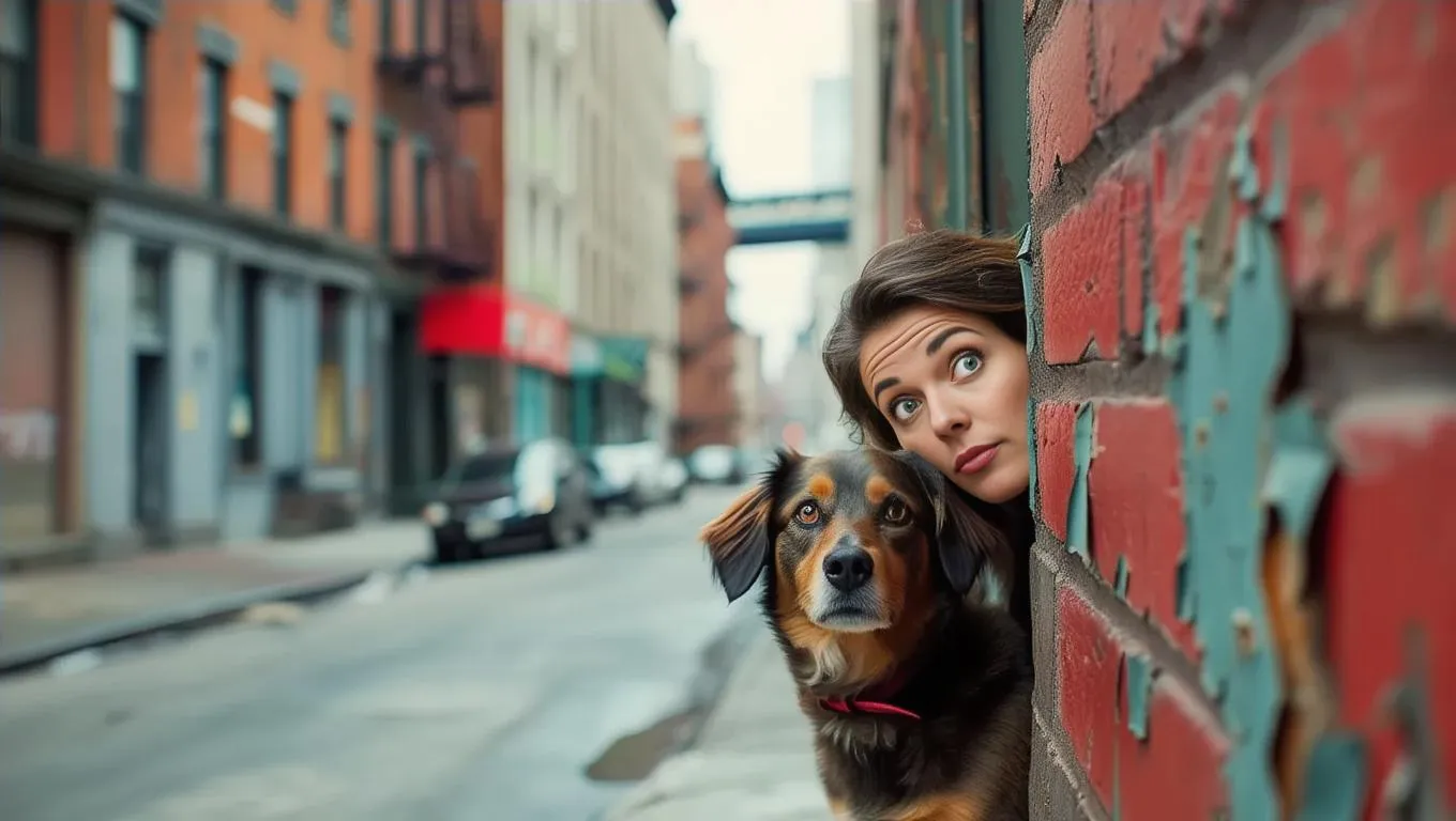 Create an AI-generated city street scene where a woman and her dog peek curiously from behind a house wall. Perfect for urban photography, digital art, or storytelling, blending playful curiosity with hidden perspectives. Use VivaGO.ai to craft vivid, dynamic visuals with lifelike details and immersive AI effects.
