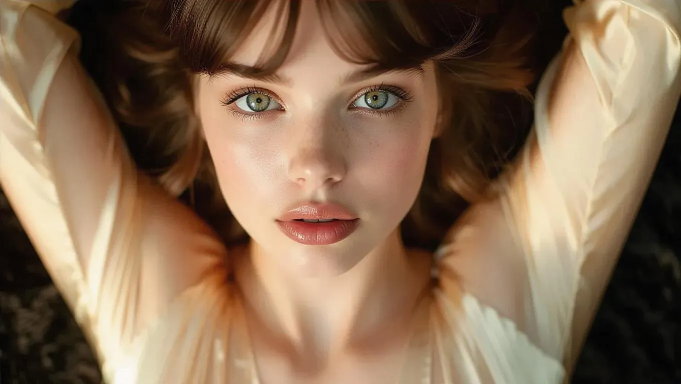 Create a hyper-realistic image of a young woman with large square eyes, with an enigmatic and seductive look, against a blurred background of black velvet. Her face is framed by soft wavy brown hair. She wears a tight cream-colored dress with satin highlights. The light is soft and golden, accentuating the volume of her lips and the bone structure of her face. Close-up with a static aerial camera, focusing on the eyes, to emphasize the intensity of the gaze.