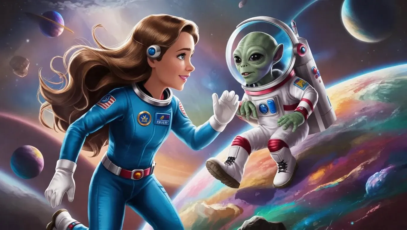 Generate Princess Nora's humorous space encounter with a tripping alien on a vibrant alien planet using vivago.ai's AI tools. Create dynamic scenes blending detailed character design (blue space suit, quirky alien expressions) and colorful sci-fi landscapes through text-to-image prompts and professional AI effects for engaging visual storytelling.
