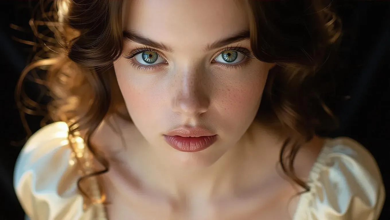 Create a hyper-realistic image of a young woman with large square eyes, with an enigmatic and seductive look, against a blurred background of black velvet. Her face is framed by soft wavy brown hair. She wears a tight cream-colored dress with satin highlights. The light is soft and golden, accentuating the volume of her lips and the bone structure of her face. Close-up with a static aerial camera, focusing on the eyes, to emphasize the intensity of the gaze.