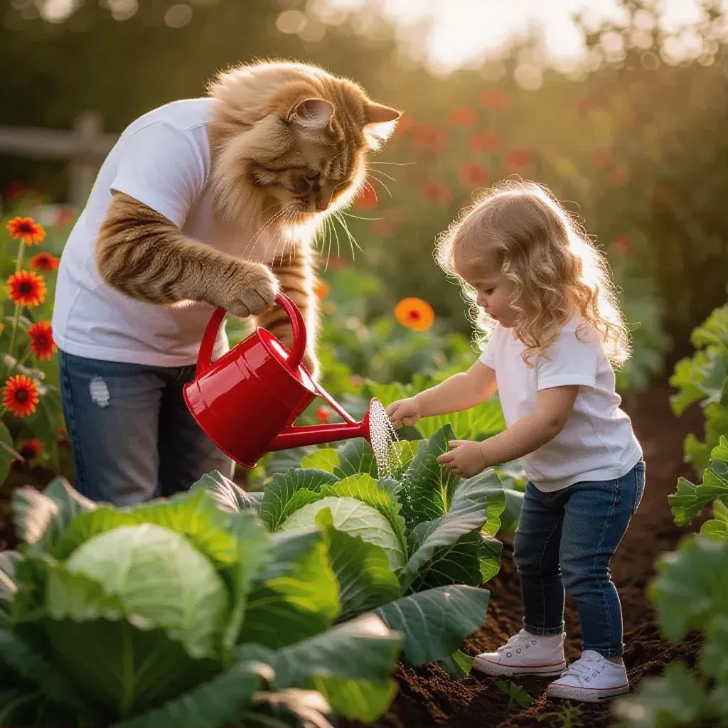 Experience vibrant AI-generated visuals of a spring vegetable garden with an anthropomorphic fluffy red cat and a curious blonde toddler. High-resolution AI photo showcases modern casual wear, cabbages, and playful interactions. Elevate creativity with vivago.ai's professional tools for stunning AI image effects and lifelike visual transformations.