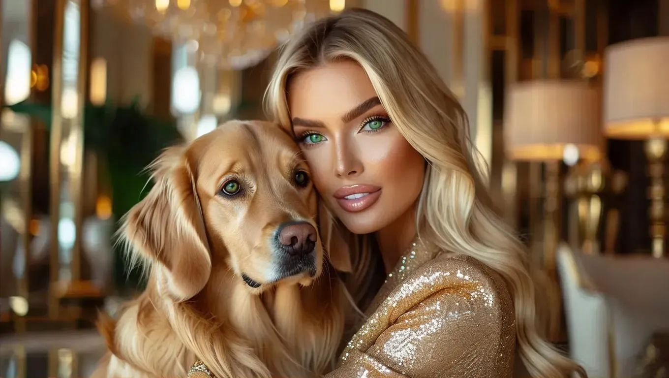 Generate stunning visuals with AI: blonde influencer with green eyes hugging her dog on a vibrant ad set. Transform text prompts into professional-grade images/videos using vivago.ai's creative AI tools. Perfect for ads, social content, or branding—craft lifelike scenes with curated effects.