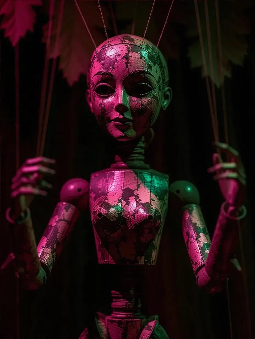 Marionette, spitegeist with a haunting green, brown, and pink color palette, intricate strings manipulating its movements, set against a dimly lit, eerie backdrop, exuding an unsettling and mysterious aura.