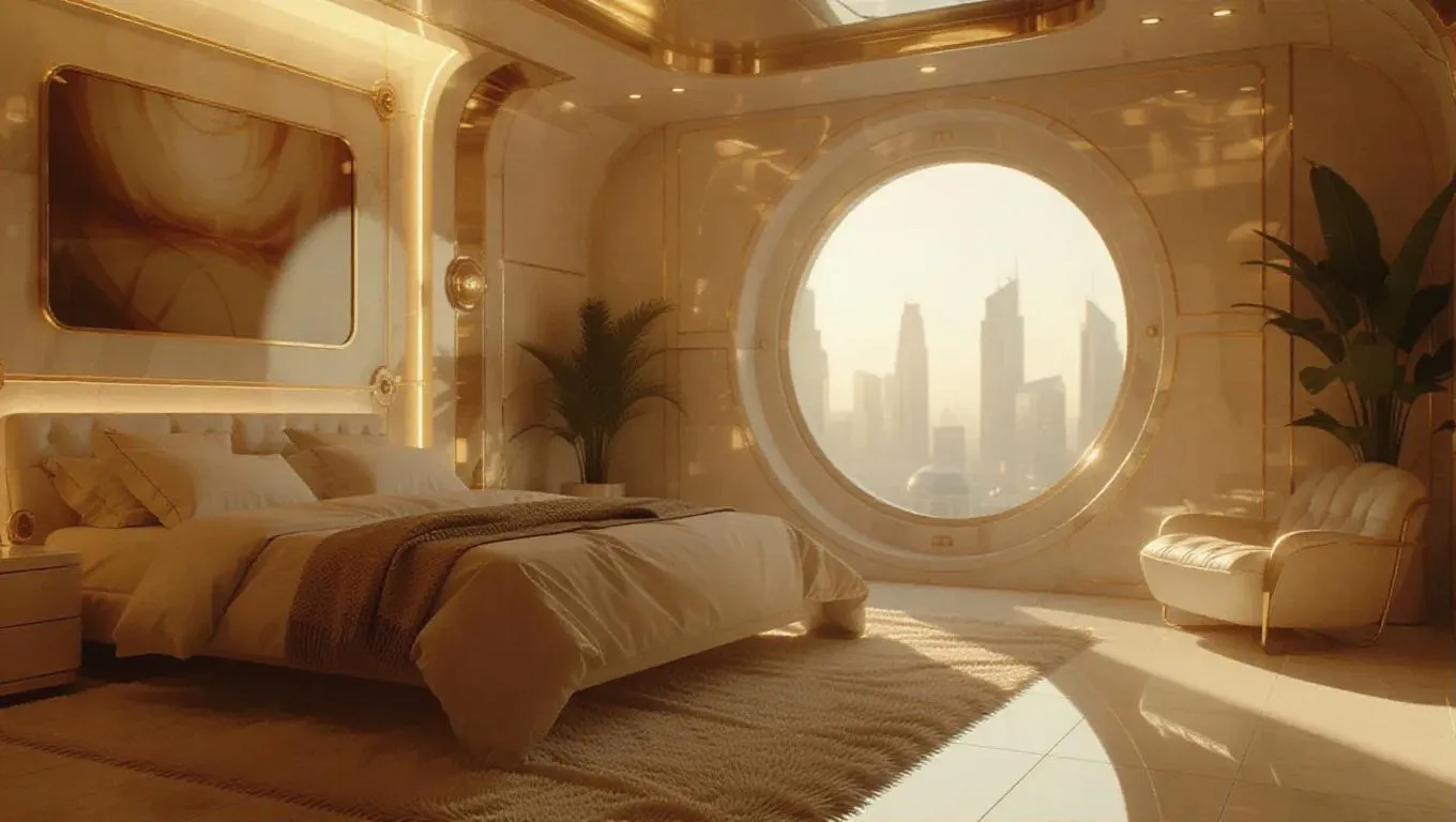 Generate ultra-realistic 8K sci-fi bedroom visuals blending art nouveau luxury with futuristic spacecraft elements. Vivago.ai crafts photorealistic, cinematic scenes merging vintage aesthetics, high-tech details, and ambient lighting for AI-generated masterpieces. Ideal for seamless retro-modern interiors, vast space views, and intricate photorealistic renders in ultra-HD resolution.