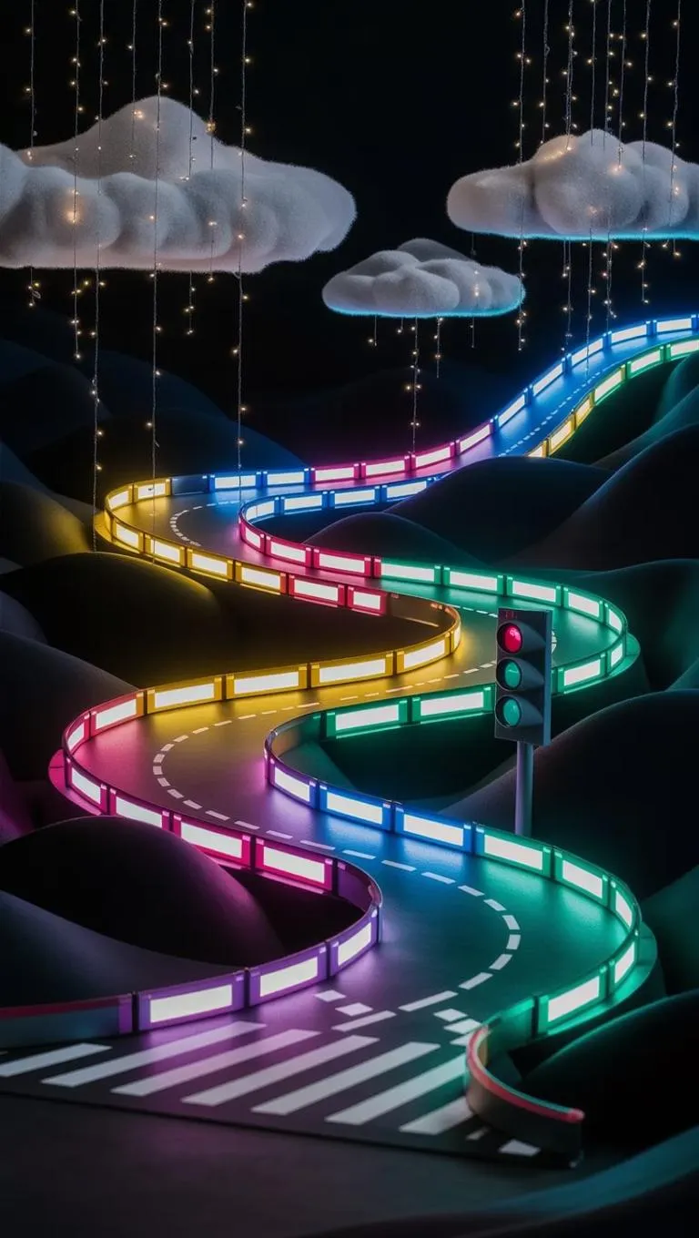 A miniature diorama of a Mario Kart-inspired racetrack set on a single large sheet, designed in the style of Rainbow Road at night. The track glows with vivid neon colors—magenta, cyan, yellow, and green—set against a deep black background and black surrounding terrain. It features sharp curves, one dramatic upward curve with a smooth light-gray ramp, and glowing edge barriers. Overhead, soft gray clouds hang low, adorned with tiny decorative lights that illuminate the scene subtly. A classic three-light traffic signal stands at the start-finish line. The track loops without being circular, forming a continuous, surreal neon-lit road.