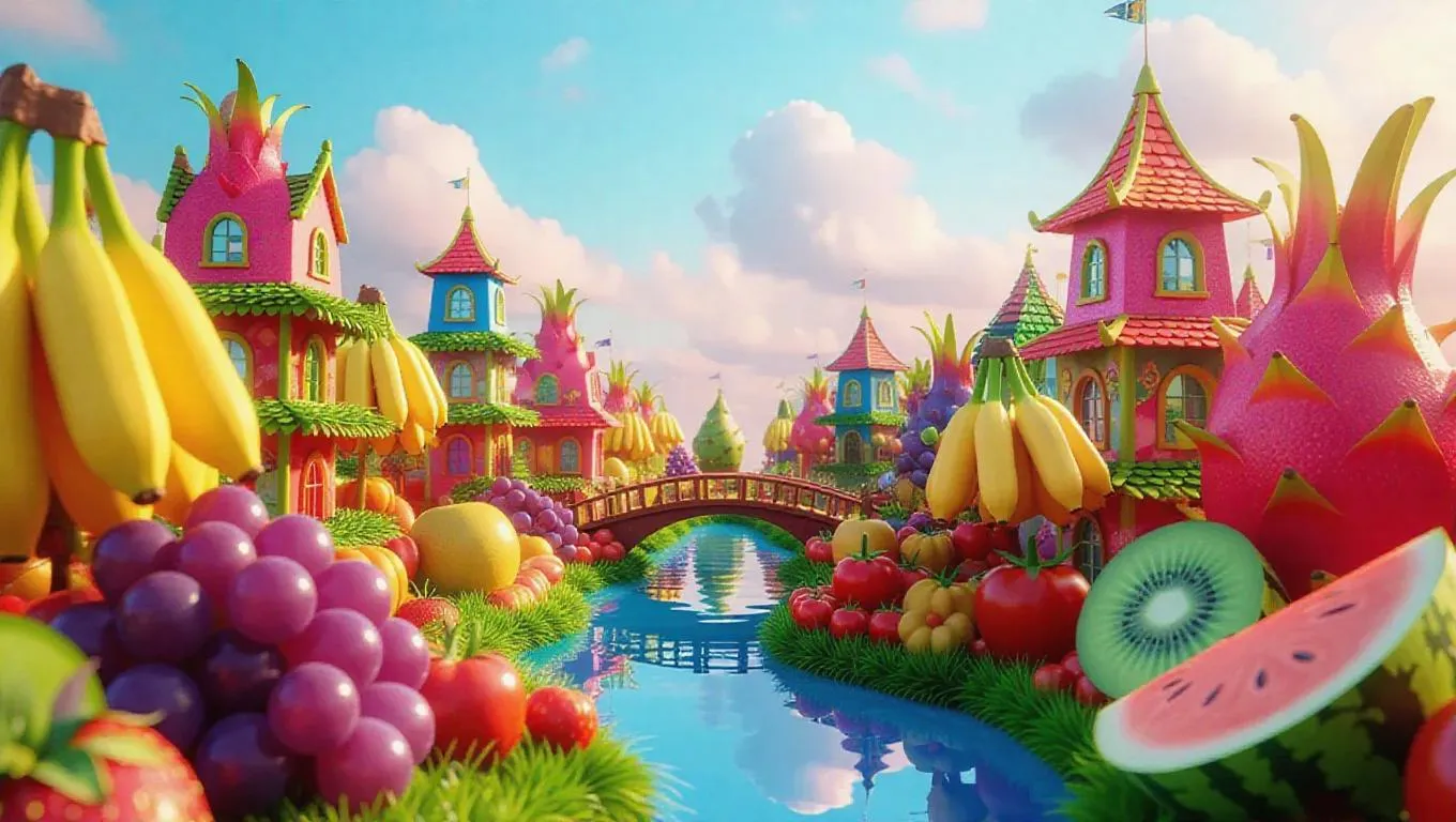 Explore an AI-generated fruit cityscape where banana bridges and kiwi shelters blend with watermelon, cantaloupe, and tomato architecture. Witness surreal, vibrant urban landscapes crafted through AI creativity, merging dreamlike fruit shelters and scrapped textures into a whimsical, futuristic metropolis.