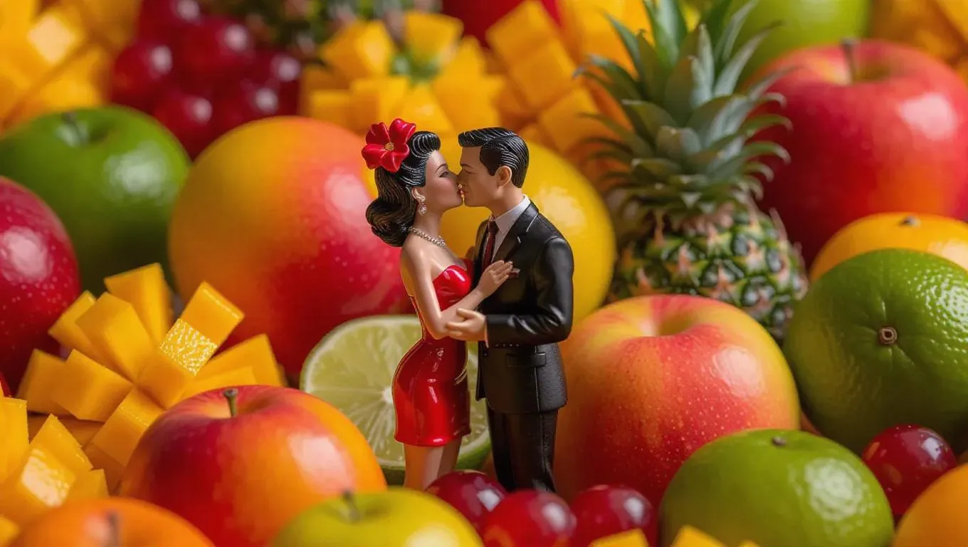Generate vibrant AI images with detailed macro photography of miniature Carmen Miranda kissing a suited man amidst tropical fruits. Vivago.ai transforms prompts into professional, creative visuals. Explore AI effects for stunning, imaginative content.