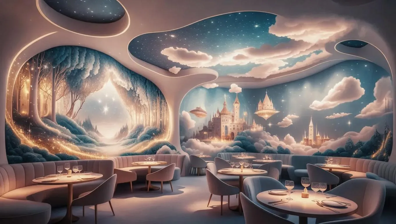 Step into a dream-inspired café with AI-generated surreal landscapes: starlit forests, floating cloud cities, and golden-hour vistas. Experience immersive dining with dynamic projections, soft lighting, and cozy seating. Watch scenes shift magically as you dine. Perfect for creatives seeking transformative ambiance powered by AI artistry and celestial-inspired visual storytelling.
