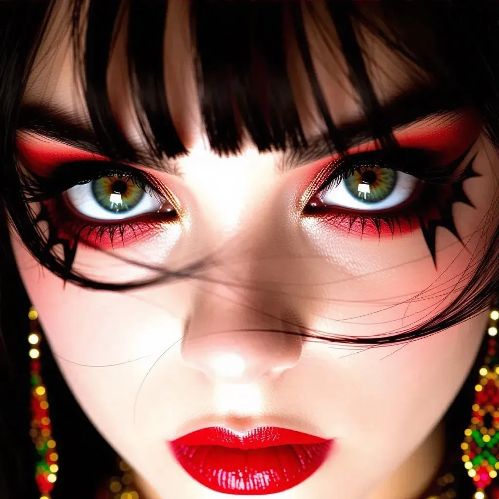 Gothic-style black female portrait inspired by Bambi Thug's Eurovision look, blending dark elegance with Palestinian tatreez embroidery. Dramatic smoky eyes, fierce gaze, flowing black dress adorned with vibrant red, green, and gold motifs. Mysterious aura, sharp-edged raven hair, defiance. AI-generated art merging Gothic aesthetics and cultural symbolism for striking, Eurovision-inspired visual storytelling.