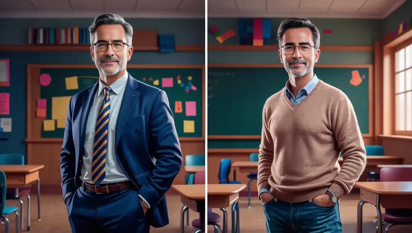Create professional AI-generated images of a middle-aged teacher in formal and casual attire with consistent expressions and full-body visibility using VivaGO.ai. Transform text prompts into high-quality visual content for educational or creative projects with advanced AI editing tools.