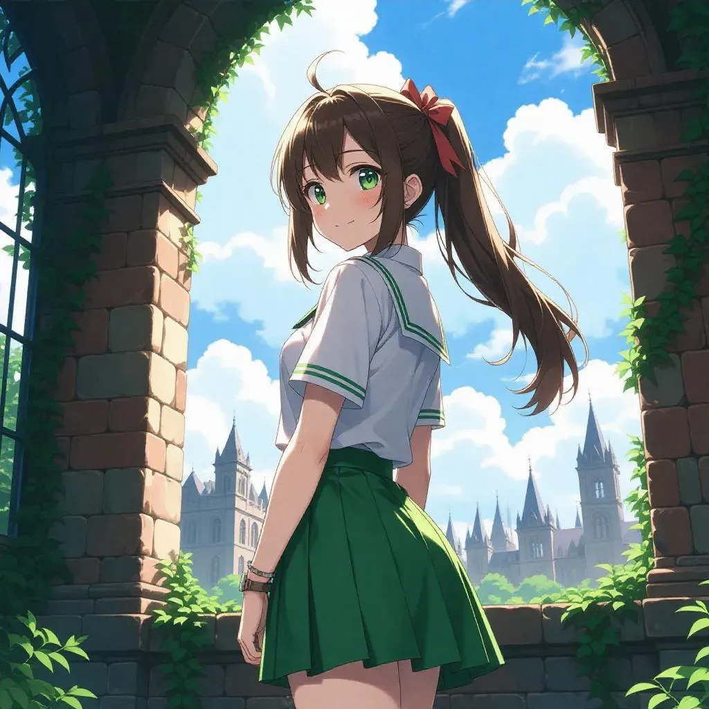 Craft vivid AI-generated images with Vivago.ai. Depict a detailed girl in a green school uniform, red ribbon, amidst overgrown ruins, vines, and cloudy skies. Ideal for professional visuals with intricate details like bracelets, wristwatches, and lifelike outdoor scenery.