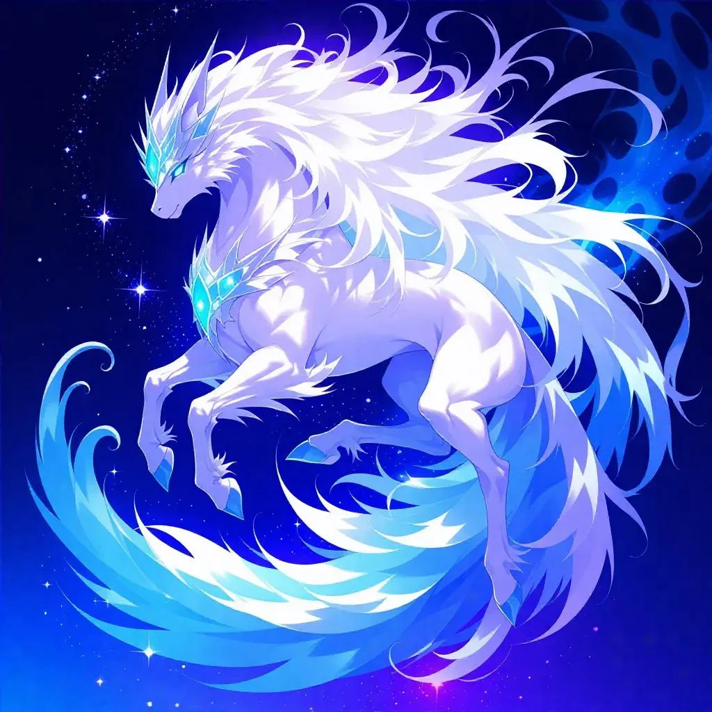 Space-themed art style, Magic Beast Rei with a mesmerizing color palette of white, dark-blue, light-purple, light-blue, and blue, glowing against a star-studded backdrop, ethereal tendrils of nebulae swirling around, enhancing the mystical aura.