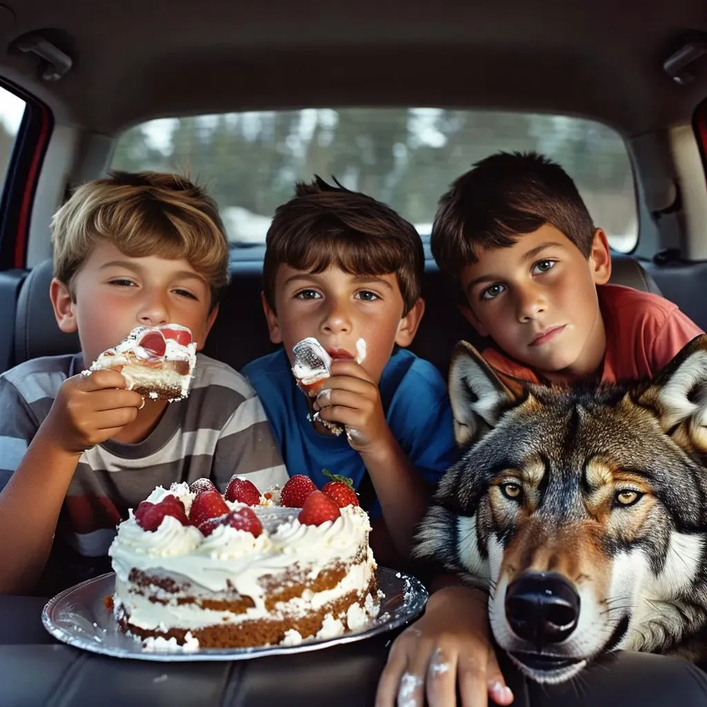 Generate a vivid AI scene of three boys in a car: one savoring cake, another making a wild funny face, and the third dreaming of wolf-riding adventures. Perfect for dynamic storytelling, humor, and creative visuals with AI image generation tools. Explore playful expressions and dream-inspired artistry for engaging content.