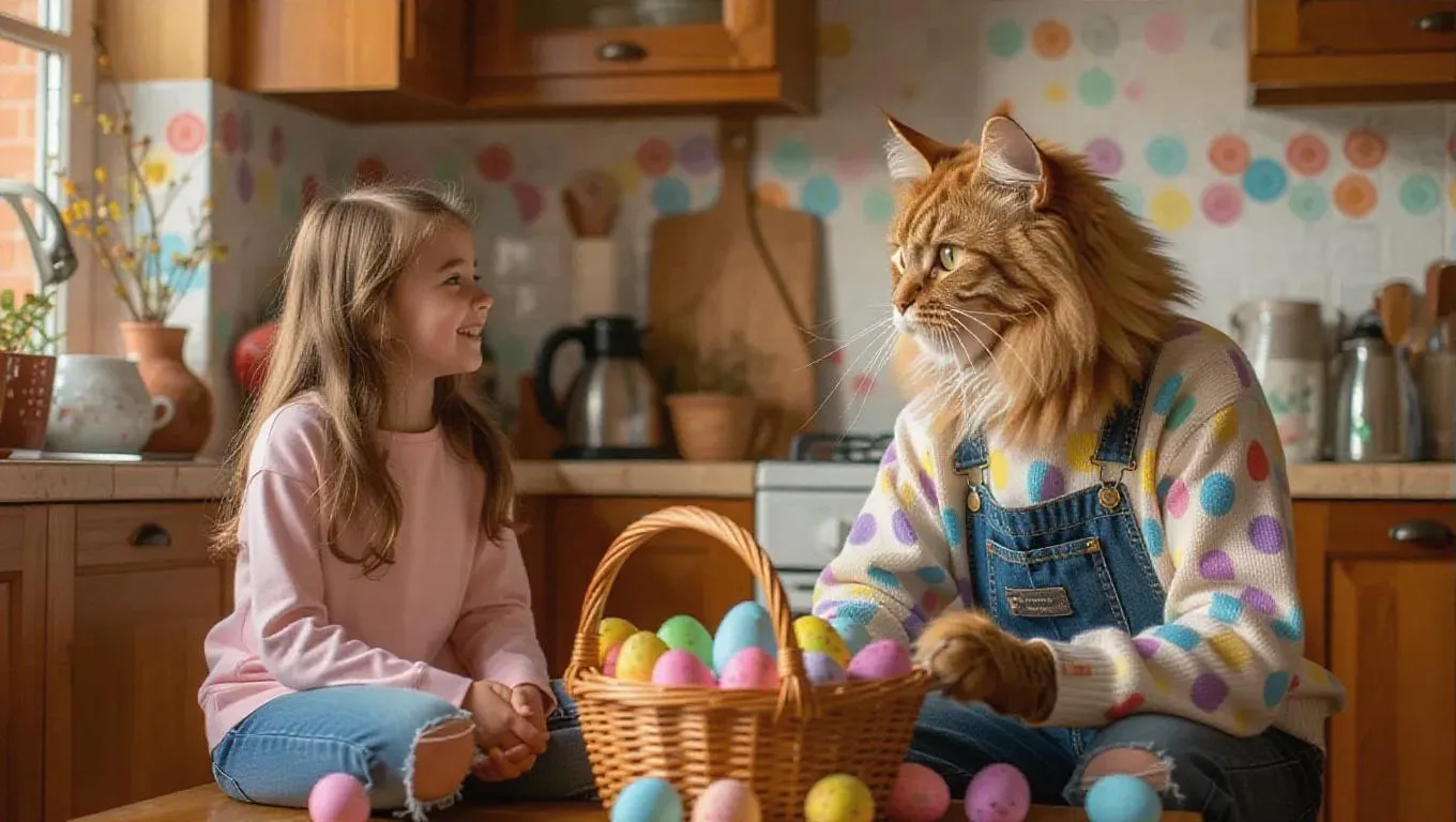 This is a moment of joyful communication between a LIGHT-HAIRED girl and a humanoid cat with a large light-red fluffy head and the body of an adult man in the process of preparing for Easter. The girl is casually sitting on the nightstand, and the CAT is collecting an Easter basket - they are in the kitchen. Their looks are full of friendliness and fun, they are clearly absorbed in the conversation. The CAT is wearing a light sweater with multi-colored paint spots, which indicates his active participation in coloring eggs. His jeans are also stained with paint and have scuffs on the knees. On his feet, he is wearing light sneakers with red stripes. His pose is dynamic, he is slightly leaning towards the girl, as if he is telling her something. The girl is wearing a gray elongated sweater and light blue ripped jeans with patches on the knees. On her feet, she is wearing red sneakers with white polka dots with a white sole and laces. She is sitting on the kitchen countertop, her legs dangling down and facing the CAT. Her pose is relaxed and casual. The surrounding space is a cozy kitchen with white cabinets, a wooden countertop and various kitchen utensils in the background - a stove, oven, kettle, dishes and other utensils are visible. On the countertop, next to the girl, there are painted Easter eggs of different colors. Easter eggs, paints, brushes, paper and other craft supplies are also scattered on the floor, which creates a sense of creative chaos and preparation for the holiday. Finished, brightly painted eggs are visible in baskets.