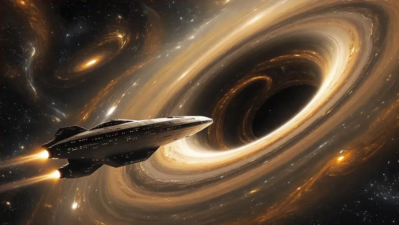 Generate a vivid AI image of a majestic futuristic spaceship approaching a black hole in interstellar space. Use vivago.ai's advanced AI effects for sci-fi visuals, space exploration art, and professional-grade editing tools to transform cosmic concepts into stunning digital masterpieces.
