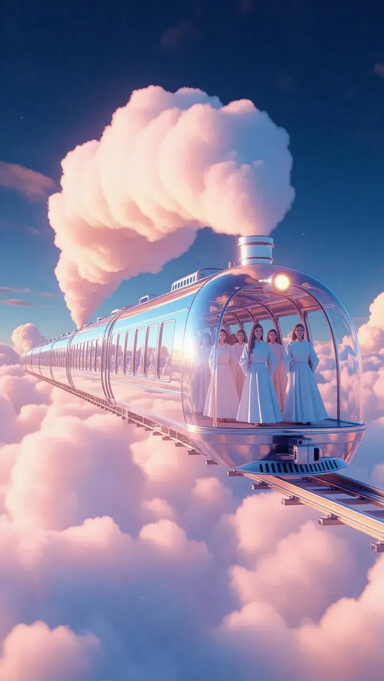 Explore a mesmerizing AI-generated 3D animation of a transparent glass train gliding through the sky. Passengers in white robes enjoy the serene journey amidst clouds, creating a surreal flying illusion. Transform your ideas into professional visuals with VivaGo.ai's advanced AI image/video tools.