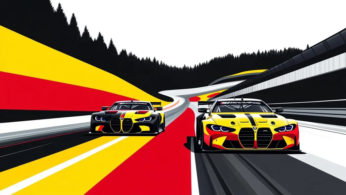 Iconic Spa Francorchamp race track in bold black, yellow, and red, mirroring the Belgian flag, minimalist art style with sleek, dynamic straight lines. One BMW M4 GT3 2022 and one Ferrari 296 GT3 2023 in high-speed motion, side by side, front view, capturing the intensity and precision of the race.