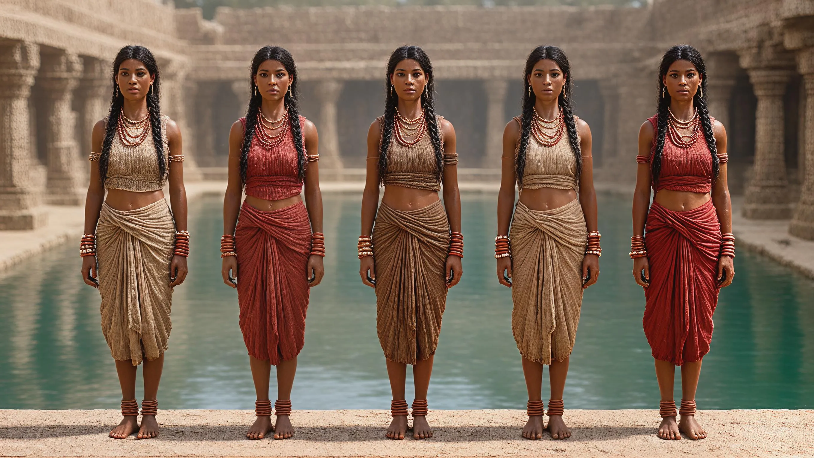 Indus Valley Harappa Culture – Ultra Photorealistic IMAGE for Vivago.ai.2 (FULL Background Restored) Ultra-photorealistic 8K still image of five identical Indus Valley women from Harappa/Mohenjo-Daro (2600–2000 BCE peak period), standing in perfect straight line formation facing viewer at foreground edge of Mohenjo-Daro Great Bath, authentic proto-Dravidian features (smooth medium-brown skin, dark almond-shaped eyes, straight black hair in long braids with shell ornaments, sturdy healthy builds). Stable, archaeologically accurate cotton clothing: Simple draped cotton dhoti-style shorts to knees + upper body wraps in natural earth tones (ochre red, beige-brown, mud-red) Terracotta bangles, carnelian bead necklaces (6-8 etched beads), shell disc earrings, ivory combs Precise positioning: tallest left → shortest right, natural height variation [CRITICAL] FULLY DETAILED PHOTOREALISTIC BACKGROUND – 50+ PEOPLE + OBJECTS: GREAT BATH (12×7m stepped pool directly behind dancers): 10 bathers using copper dippers, water surface reflecting golden hour light IMMEDIATE BACKGROUND (20m depth): 15 MEN (dhoti + wraps): carrying 20kg grain sacks from granary, pushing wooden carts w/ wheel-turned pottery, grinding copper razors on stones, weighing carnelian beads on cubical stone scales (1:2:4 system) 25 WOMEN (knee-length skirts + shoulder wraps): grinding grain on saddle querns, spinning cotton at looms, filling water jars from brick wells w/ pulley ropes, carving conch shell bangles 12 CHILDREN (small draped cloths): playing w/ terracotta bulls/birds, mini wooden carts, clay whistles FOREGROUND OBJECTS (scattered around dancers' feet): 10+ unicorn seals (clay tablets w/ Indus script), cubical stone weights, etched carnelian bead piles, lapis lazuli chunks, small ivory tusks, copper fishhooks/razors MIDGROUND (50m depth): Potters spinning wheels (red pottery), perlenmacher drilling carnelian, farmers w/ wheat/cotton bundles, fishermen mending nets FAR BACKGROUND (lush monsoon valley): Green wheat/cotton fields, flowing Indus river w/ reed boats, golden hour mist ARCHITECTURE: Baked brick walls (1:2:4 ratio) w/ geometric arches, active street drains flowing, courtyard houses w/ flat roofs, NO ruins/palaces Ultra-photorealistic details: Skin pores/sweat sheen/dust on ALL 55+ figures' feet Cotton weave texture, brick mortar gaps, copper patina Perfect depth of field: razor-sharp foreground dancers + objects, detailed populated background Warm golden monsoon lighting, physically correct shadows