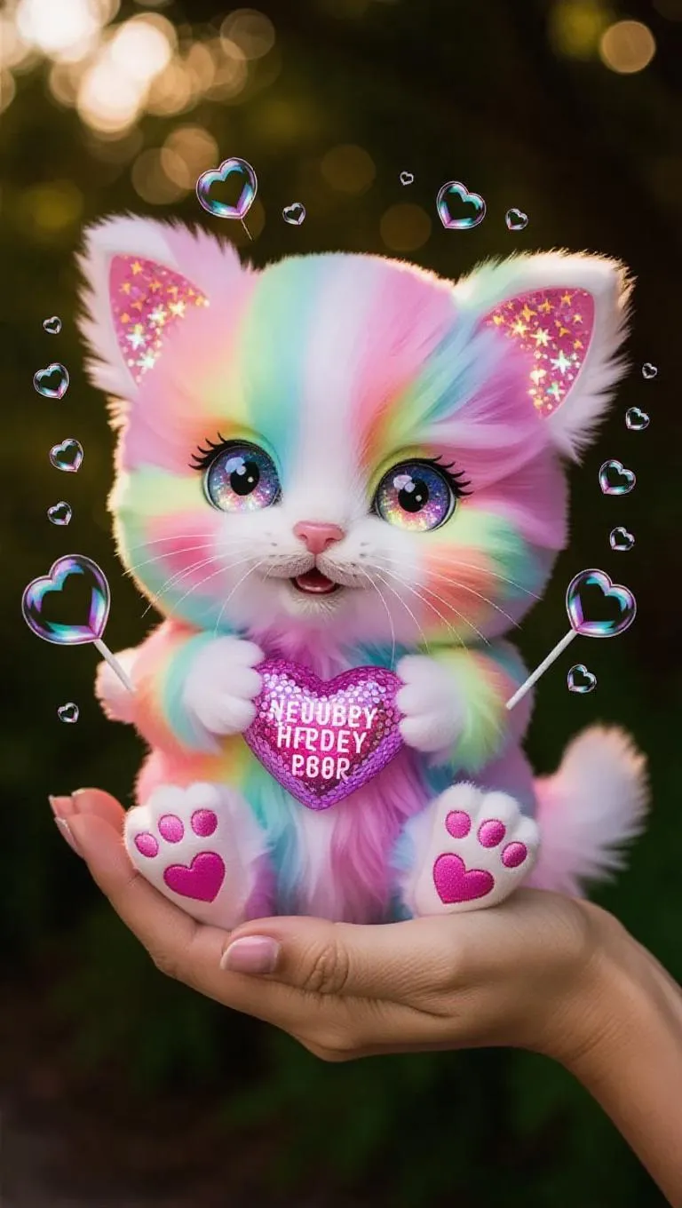Create an AI-generated SnuggleBud plush with sparkling pastel galaxy eyes, holographic blush cheeks, and rainbow fur with heat-reactive glowing hearts. Interactive embroidered paws mew-mew, LED cherry blossoms bloom with laughter, vanilla-scented bubbles from its lollipop tail. Curls into a whispering donut nest when idle. Candy-colored dreamcore design with vaporwave lighting, holographic cookies, and pawprint adoption certificate. Irresistibly tactile AI magic.