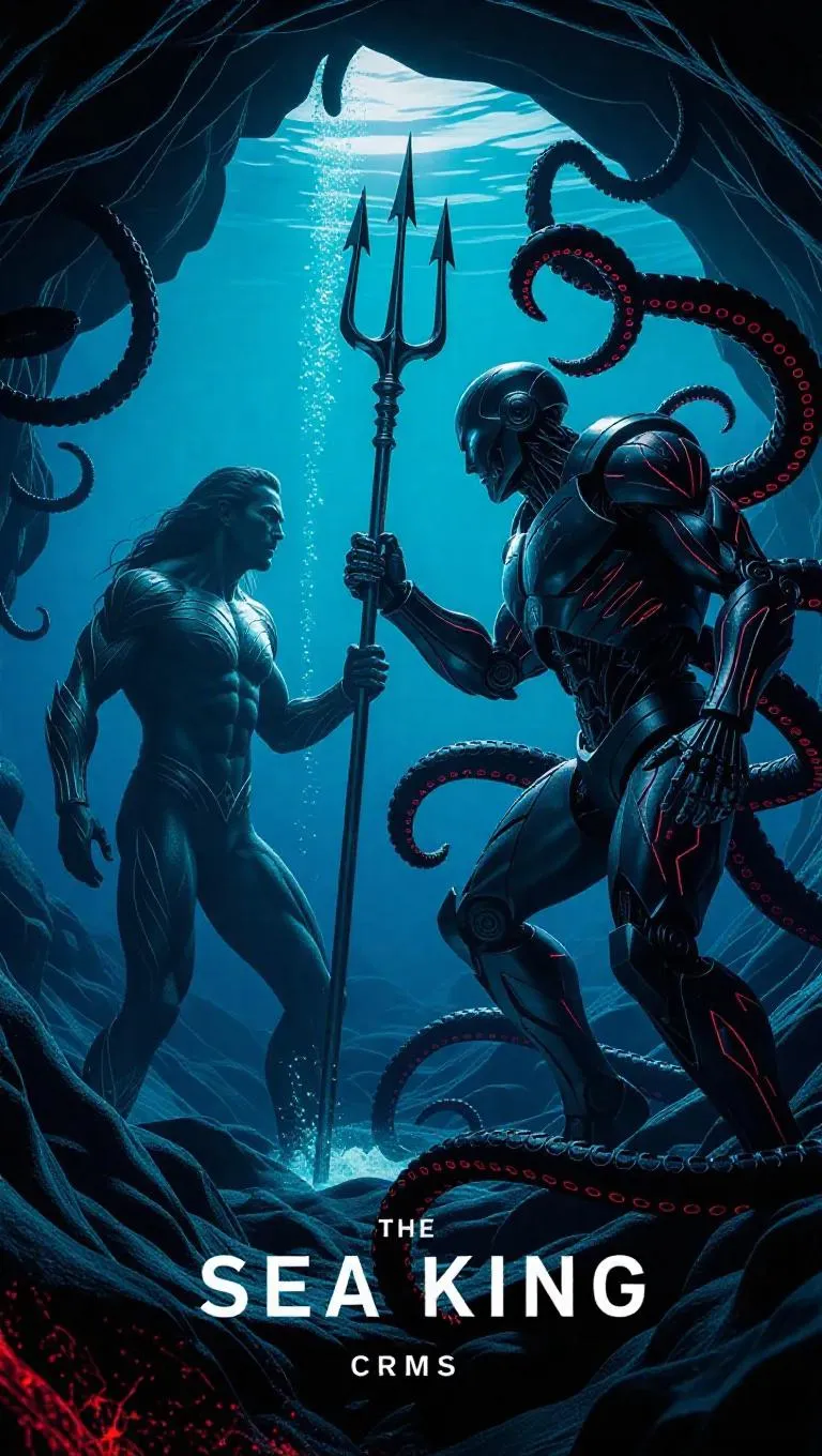The Sea King, armed with a trident, confronts Ultron's mechanical tentacles in an underwater rift. Floating in the rift are the ruins of Atlantis and the remains of future technology, and the water is fluorescent blue with energy pollution. Neptune's cloak transforms into a water element, and Ultron's mechanical body oozes black liquid. Marine punk style, emphasizing water wave reflection and mechanical corrosion. 8K resolution, Octane rendering (fluid simulation, water wave reflection). Ocean punk thick paint, highlighting water element and mechanical structure. Contrast between fluorescent blue and dark black, with red energy in the cracks. Avoid low-precision water waves, cartoonish sea creatures, blurred mechanical details, NSFW elements.