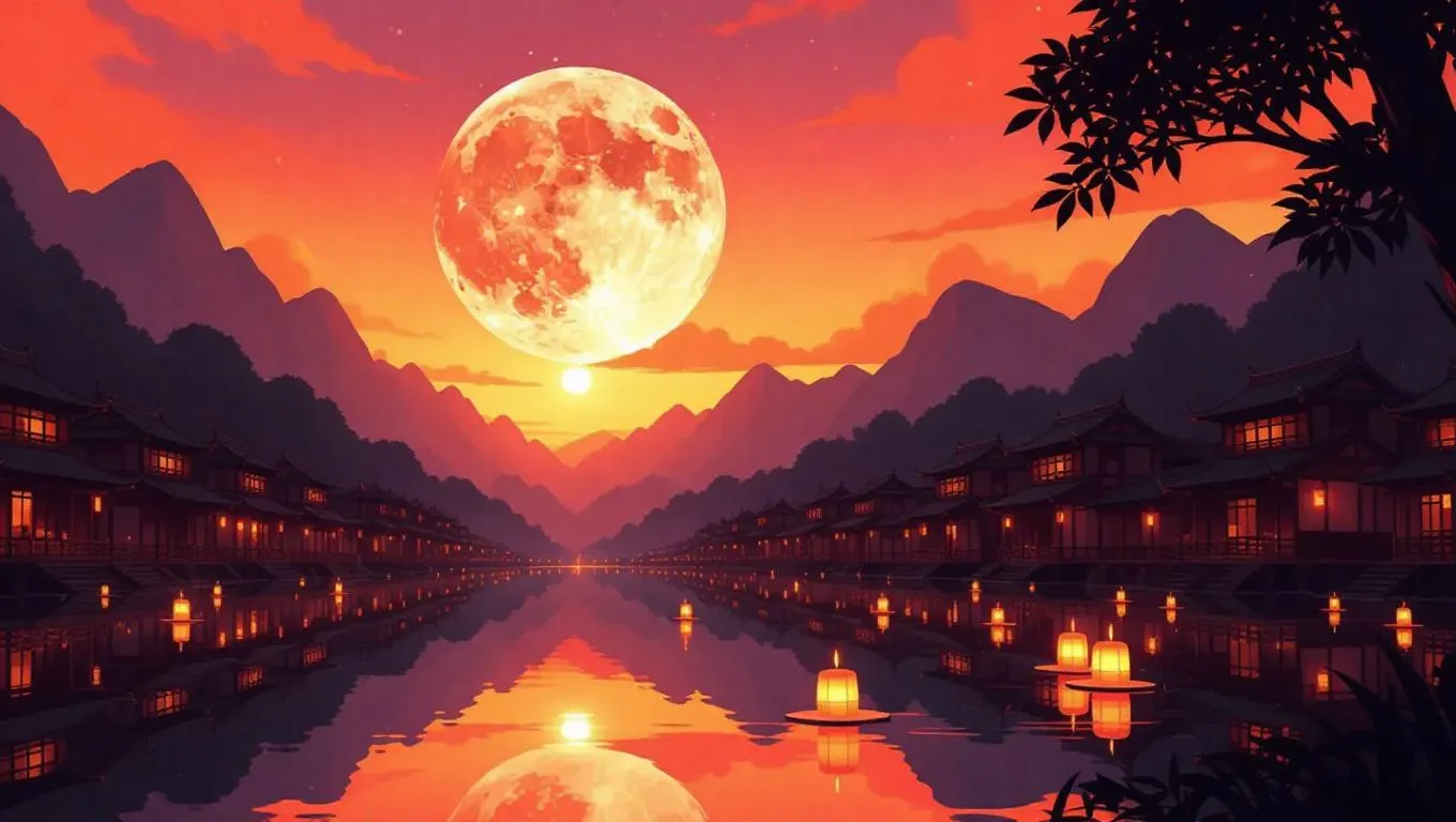 Immerse in a Ghibli-inspired fantasy village under a glowing mandarin moon. AI transforms prompts into serene anime scenes with floating fruit candles, watercolor skies, and abstract lanterns. Perfect for emotional, peaceful digital illustrations. Create professional AI art with Vivago.ai’s curated tools for ethereal moon festival visuals.