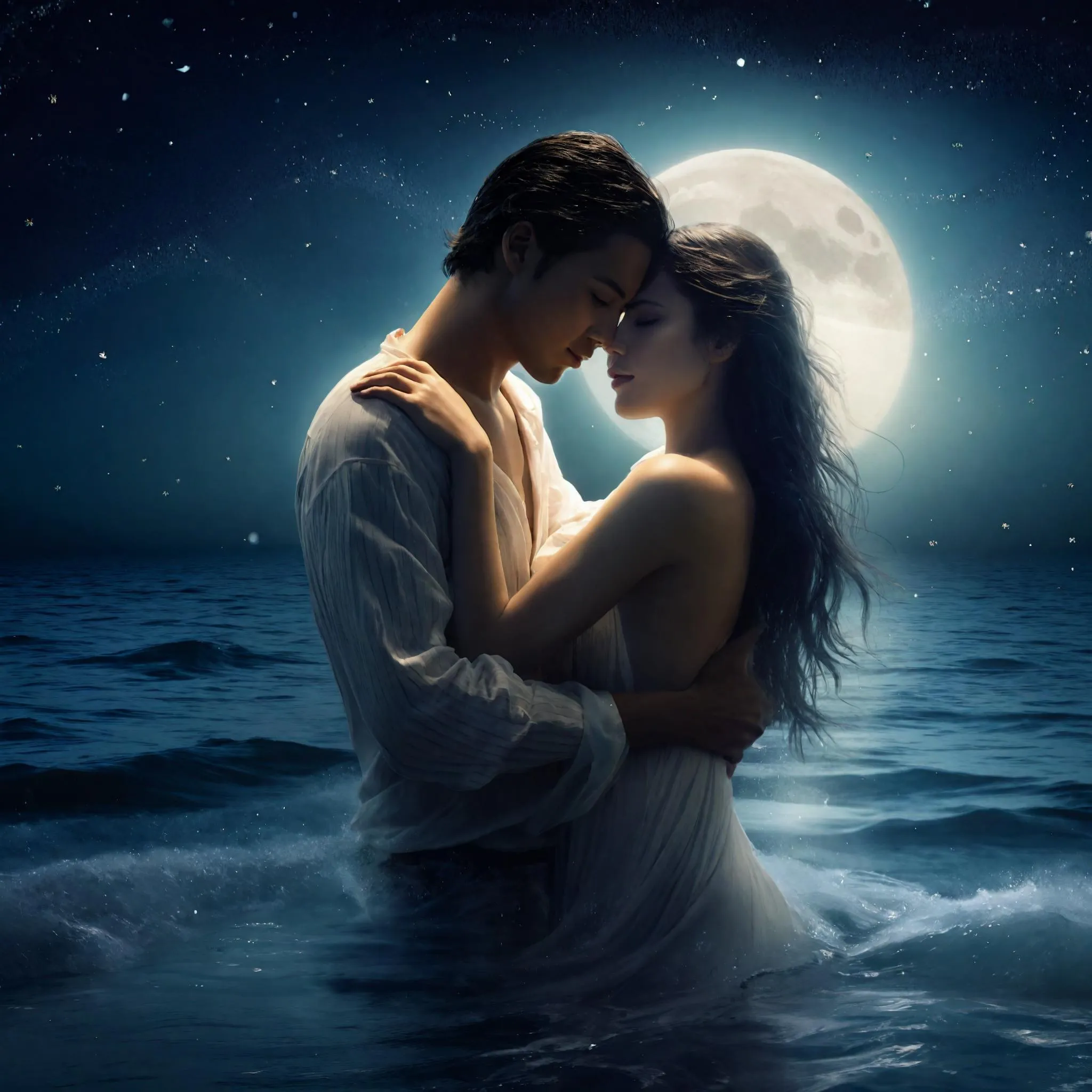 A romantic couple, a man and a woman, embrace each other affectionately in the ocean at night, under a prominent white full moon, with a backdrop filled with countless stars and wispy clouds forming a magical and serene atmosphere. The woman has long, wet black hair draped over her bare shoulders, with her eyes closed, her head resting on the man's chest. The man is wearing a partially unbuttoned white shirt, embracing her with both arms, his cheek gently pressed against her temple. Both of them appear to be emerging from or submerged in the water up to their chests, with their wet skin and clothes visible. The water around them is a deep blue, gently rippling, reflecting flecks of moonlight, in the vast open ocean. Style: Photorealistic, Romantic Art Lighting: Moonlight, Bright light from the moon, Soft blue ambient light Composition: Medium close-up, Rule of thirds Details: Wet hair and skin, gentle ripples in the water, subtle reflection of the moon in the water, calm and gentle moo