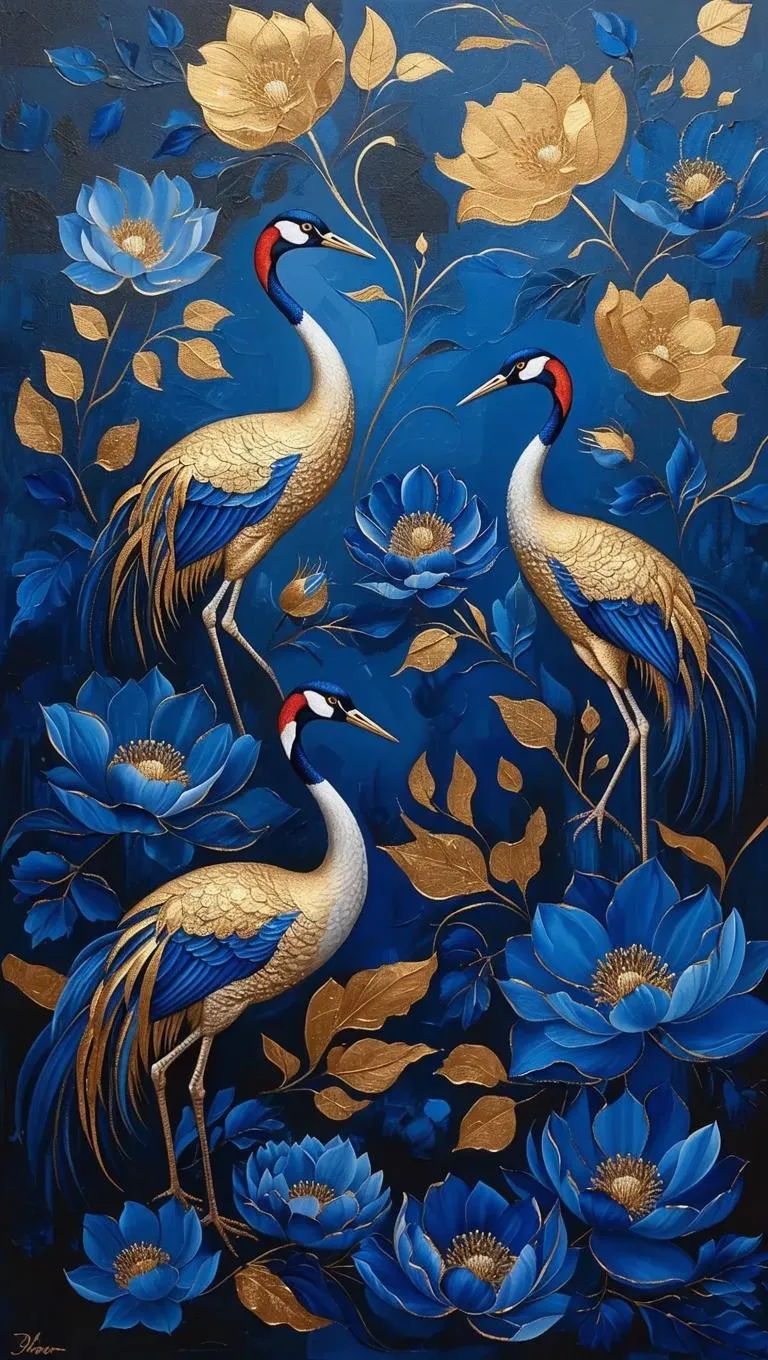 Experience AI-generated abstract art blending Rococo elegance and Chinese Punk edge with vivid blue florals, golden cranes, and intricate hand-drawn details. Vivago.ai transforms prompts into striking visuals featuring deep sapphire blues, metallic golds, and bold contrasts - perfect for creating lavish, realistic designs with avant-garde AI effects and professional editing tools.