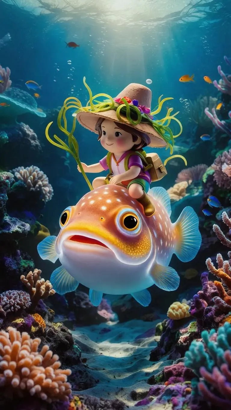 Dive into vibrant AI-generated ocean adventures with a tiny explorer in a seaweed hat riding a puffed-up pufferfish through a glowing reef. Transform your text prompts into whimsical underwater scenes using vivago.ai's creative AI tools for stunning, professional-grade visual content. Explore limitless creativity today!