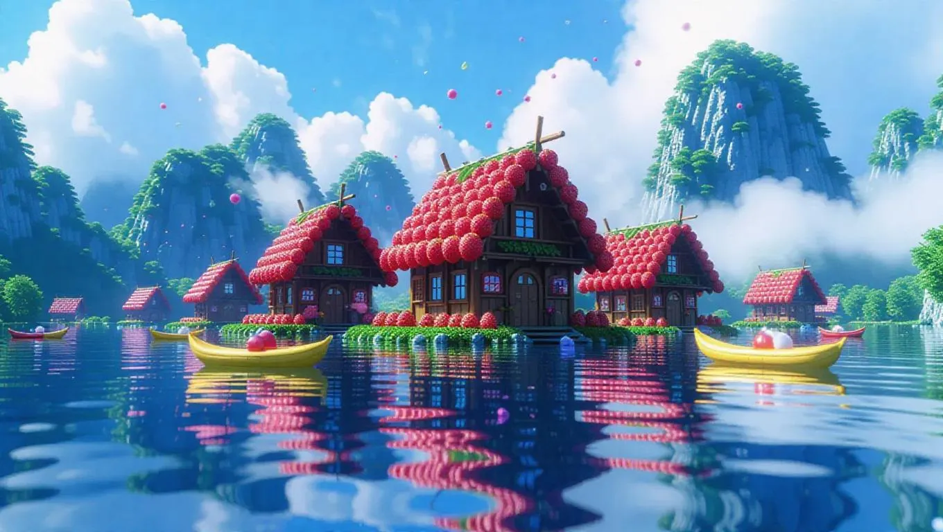 Discover a Ghibli-inspired AI-generated floating fruit village with strawberry houses, banana boats, and blueberry mountains. Experience nostalgic summer vibes through pastel watercolor textures, colored pencil details, and dreamy lighting. Perfect for playful fantasy world creations—explore Vivago.ai’s AI tools for enchanting digital concept art.