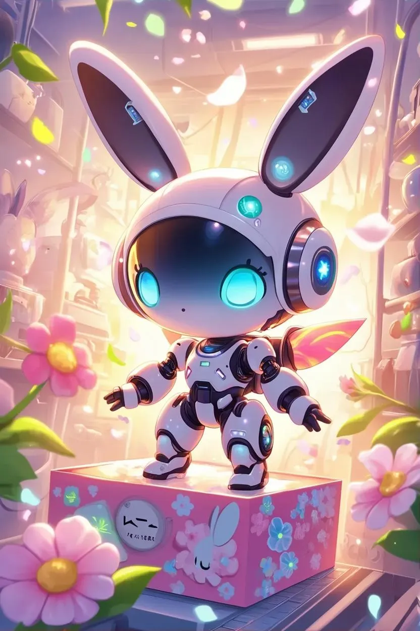 Create AI-generated anime robot bunnies with propeller ears, jetpack tails, and holographic eyes in a spring-themed box. Features flower explosions, glowing stickers, pastel decals, and a bunny toy assembly line backdrop with floating petals for vibrant, imaginative visuals.