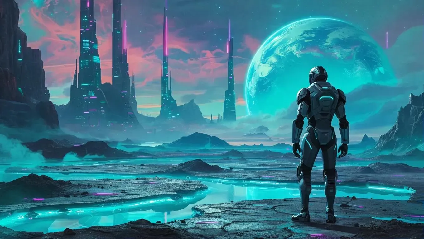 Immerse in an AI-generated aqua futuristic realm: robotic-clad figures wander psychedelic landscapes with glowing craters. Create spooky, surreal visuals using vivago.ai's AI image/video tools for sci-fi scenes, neon-drenched environments, and cybernetic fashion. Transform prompts into vivid, otherworldly art.