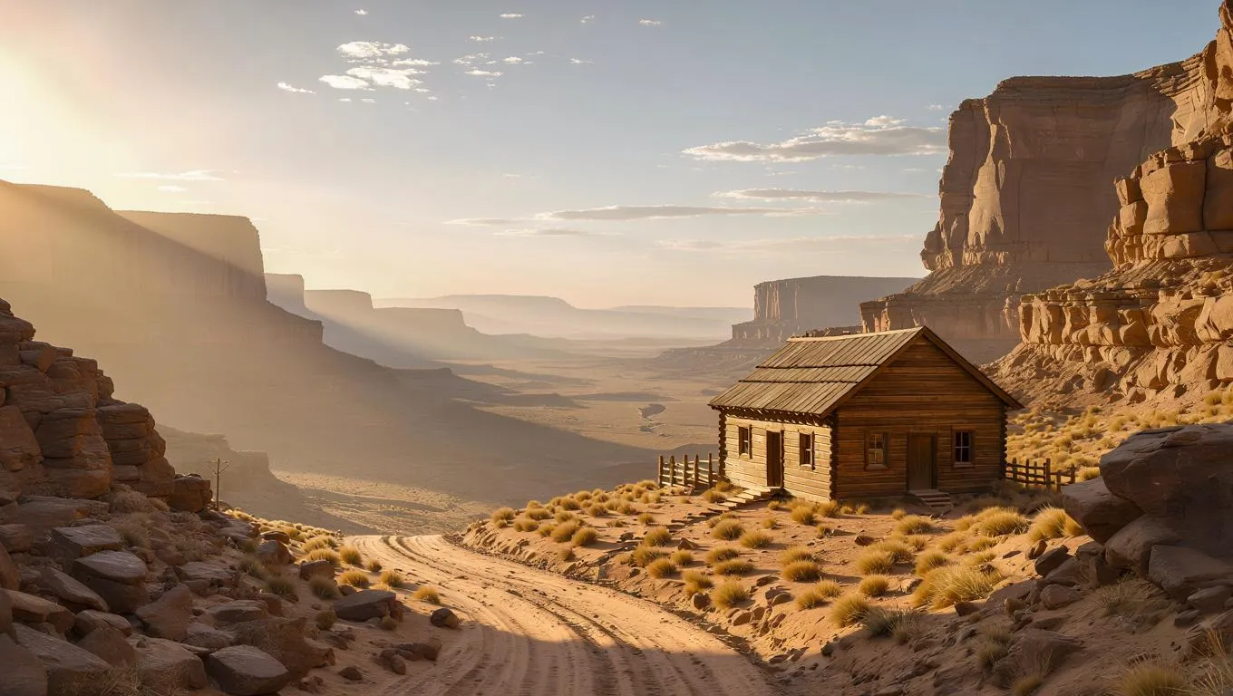 In a vast desert landscape in the far West, a wooden fort stands in a valley surrounded by rugged canyons. A faint, winding path leads to the fort, barely visible against the arid terrain. The scene is bathed in warm, golden sunlight, casting long shadows and highlighting the rough textures of the sand and rock. The fort's weathered wood contrasts sharply with the stark, natural surroundings, creating a sense of isolation and rugged frontier life. Style: Realistic.