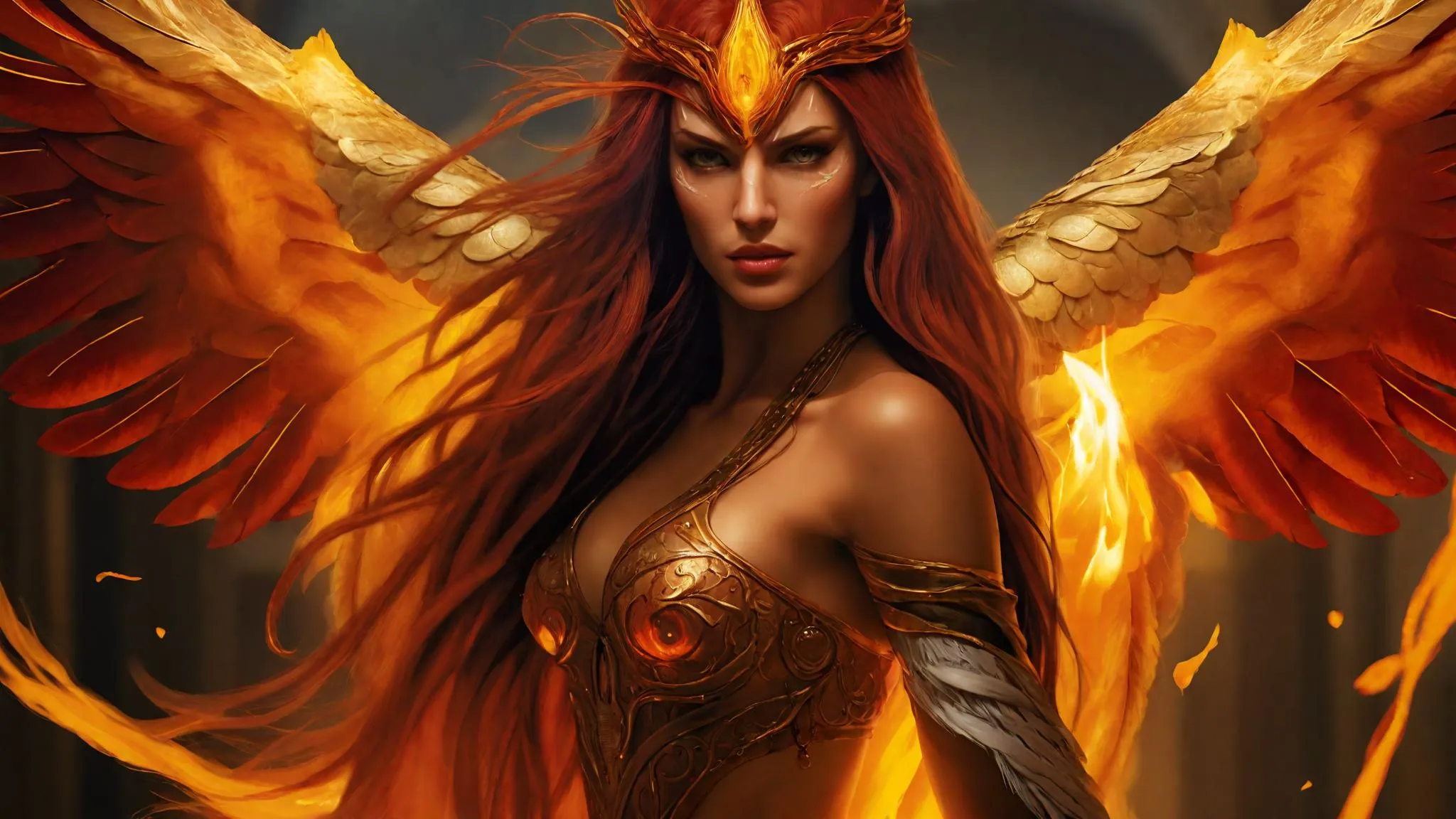 Captivating fantasy battle scene featuring a fierce Hawk Warrior with glistening bronze skin, intricate gold armor, and majestic wings. AI-generated visual content highlights her warrior prowess, mysterious battle mask, and dynamic pose. Perfect for fantasy art, gaming, and AI-powered creative projects. Explore vivago.ai for stunning AI image generation and effects.