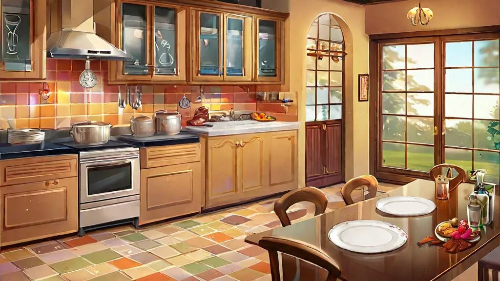 A 90s video game-style kitchen featuring beige cabinets with glass doors displaying plates and cups, front wall view, vector art, cartoon, Disney-style, concept art, color field painting, vibrant and nostalgic, clean and crisp lines, playful and cheerful atmosphere.
