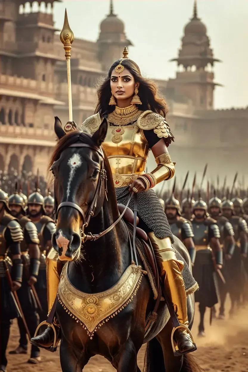 Generate epic AI fantasy art of a warrior princess in Indian-style golden armor riding an armored black horse. Create dramatic battle scenes with massive black-clad armies using advanced AI tools for professional digital art, detailed armor designs, and mystical warrior queen imagery.