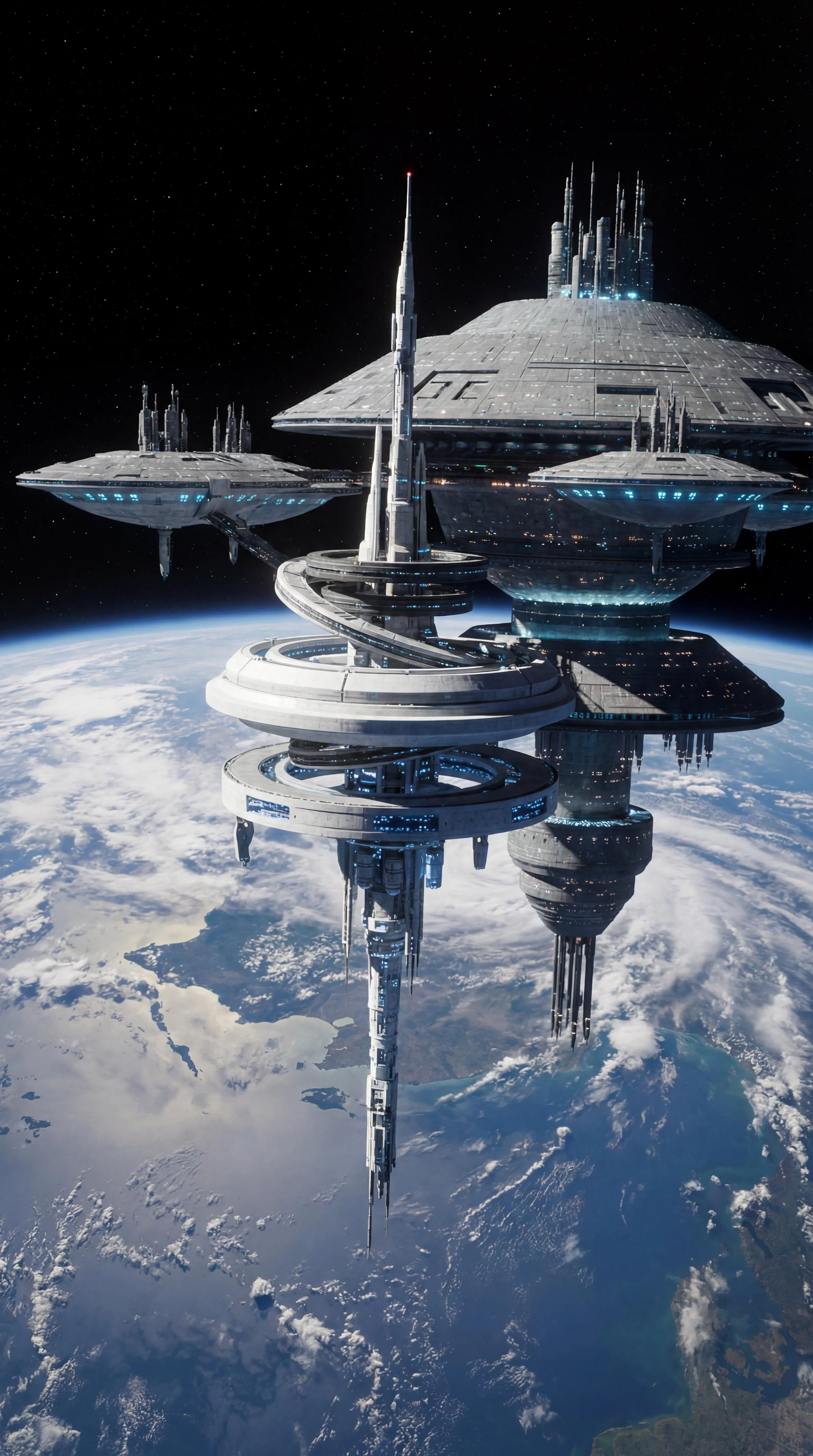 Fuse S.A.B.E.R. (MCU) & Sol Station (Star Trek) into one seamless geostationary space station orbiting Earth. AI-generated concept art, no logos. Create unique sci-fi fan art with Vivago.ai's professional AI image tools. Visualize immersive, merged space station designs.