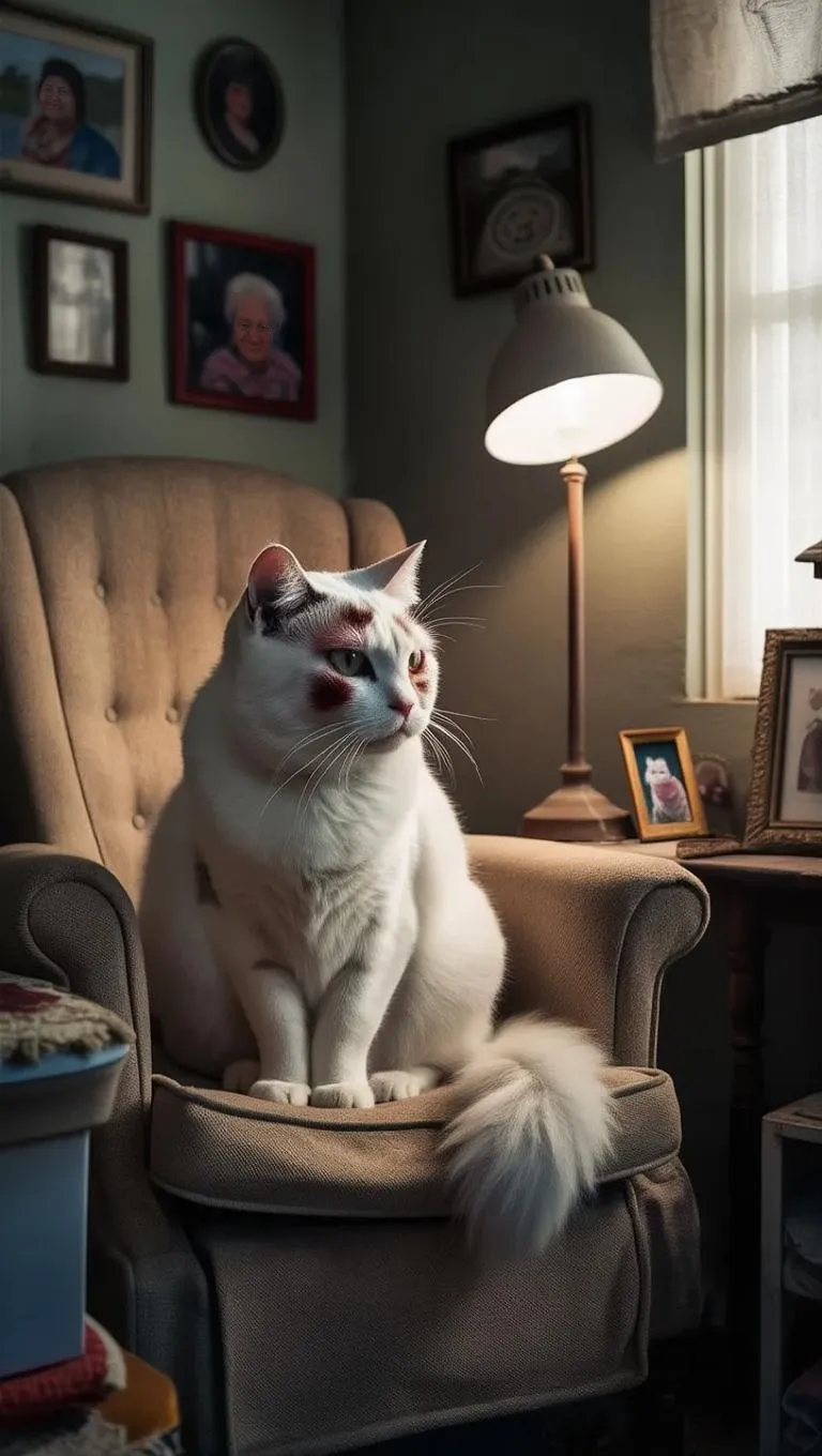Create AI-generated images of a heartfelt anthropomorphic mother cat with a blind eye and scars in a modest home setting using VivaGo.ai. Transform text prompts into emotional visual storytelling with professional AI effects for realistic anthropomorphic characters, detailed home environments, and expressive narrative scenes.