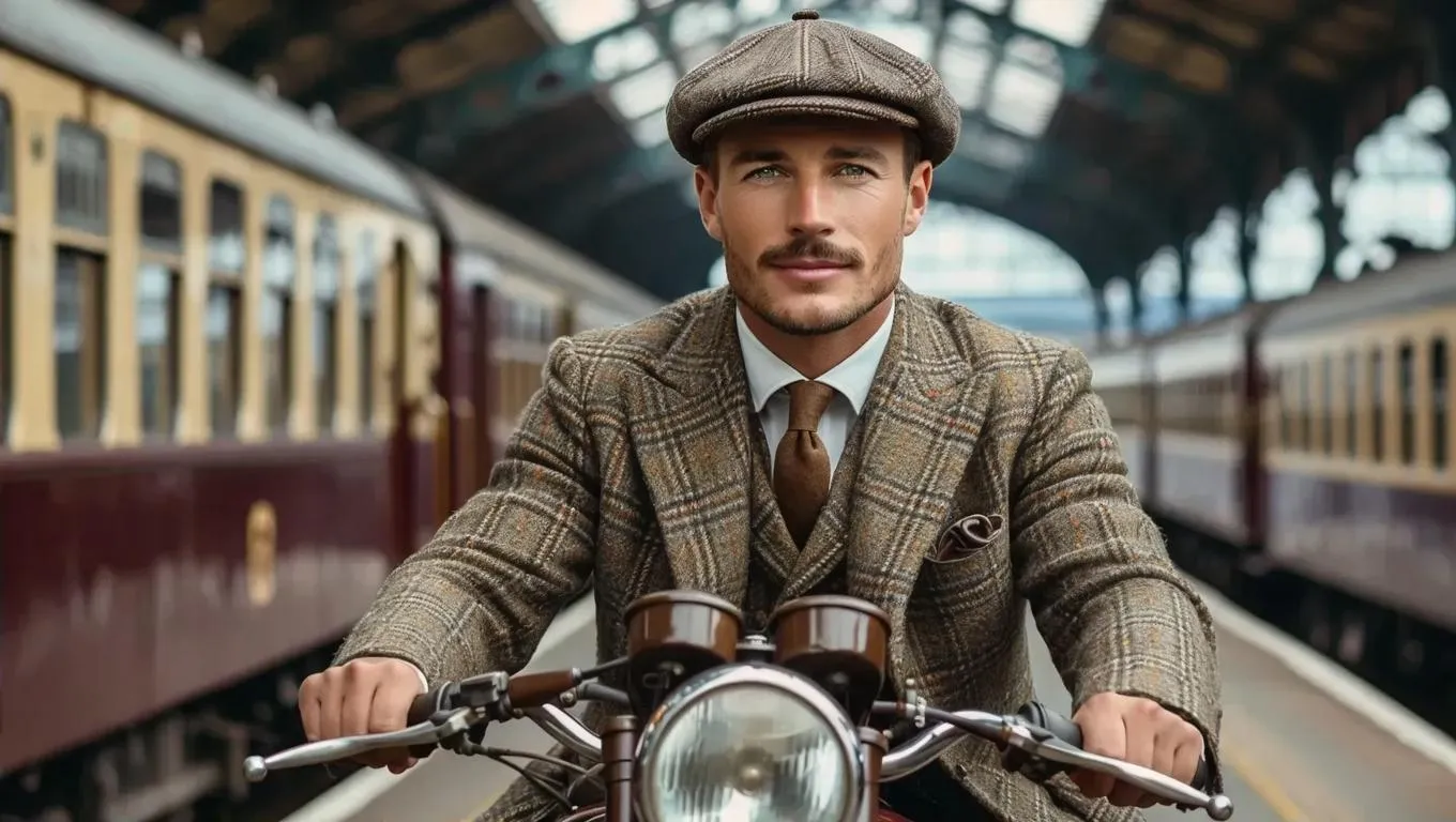 Create a retro-styled AI image of a middle-aged man with brown hair in a tweed suit and flat cap, posed confidently on a vintage motorcycle at a train station. Ideal for nostalgic visuals, historical themes, or vintage design projects. Explore AI creativity with VivaGo.ai's prompt-to-image tools.