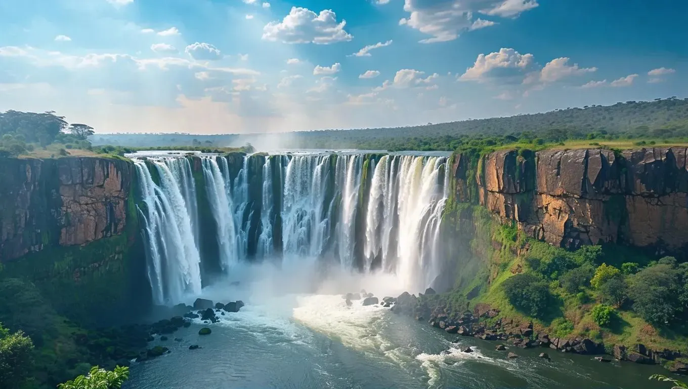 Capture the majestic beauty of Victoria Falls, Zimbabwe, on a clear day with AI-powered image generation. Transform text prompts or reference images into stunning visuals of this natural wonder using advanced AI effects and professional editing tools for vivid, high-quality results.