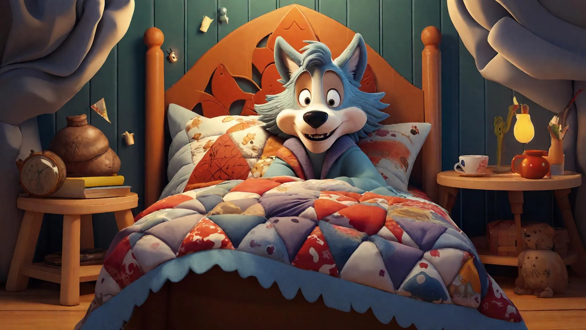 Transform your "wolf in granny's bed" idea into whimsical 3D cartoon art with vivago.ai. Generate Pixar or Disney-style scenes blended with Dune-inspired textures for playful, family-friendly storytelling. Elevate creative projects using AI-powered visuals, dynamic effects, and professional editing tools. Perfect for animated twists on classic tales.