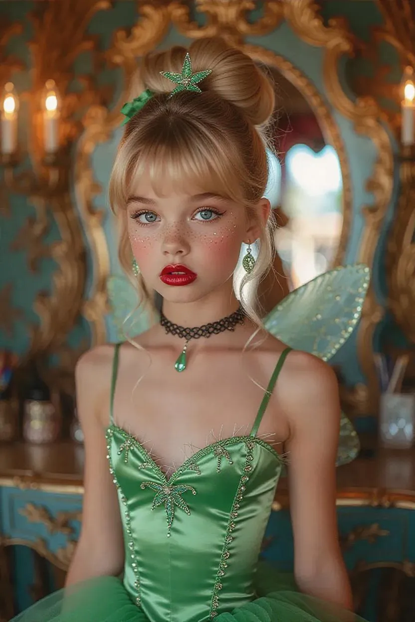 Create an adorable AI-generated fantasy image of a tween boy transformed into Tinkerbell with blonde hair, bold makeup, and Disney-inspired details. Vivago.ai crafts magical AI art featuring costume designs, diva poses, and enchanting scenes like Disneyland vanity setups for whimsical character transformations.