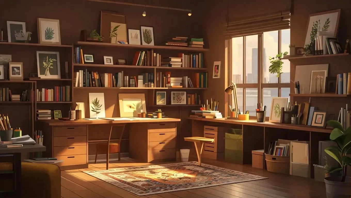 Transform your space into a cozy studio room featuring an art desk, bookshelves, and a lounge vibe. AI-generated imagery captures the warm, dark brown aesthetic for a relaxing creative environment. Perfect for artists and writers seeking inspiration through curated AI effects and professional-grade visual tools.