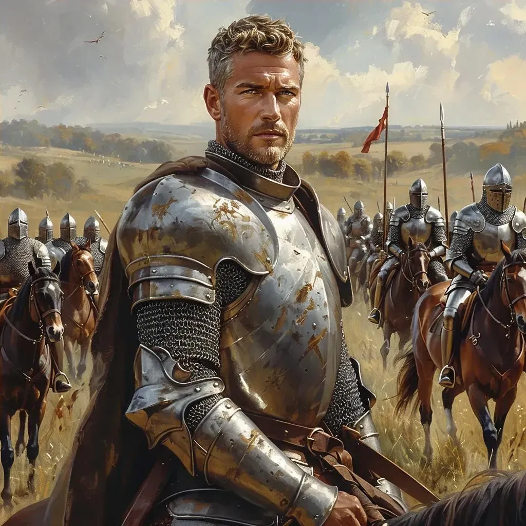 Create heroic knight imagery with AI: Generate Damen, the determined leader with hazel eyes, grey hair, and a golden sword. Capture his angry resolve and fierce battle smile, clad in stainless steel armor and a red cloak. Perfect for dynamic character art blending intensity, ancient aesthetics, and AI-powered creative precision.