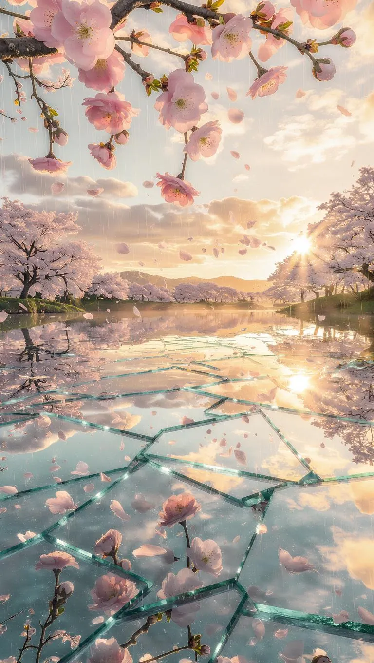 A surreal floating garden above a mirror-still lake, where suspended peach blossoms hang frozen midair. The fractured mirror below reflects fragmented versions of spring — gentle rain, golden dawn, pastel skies — each shard telling a different dream. Time appears paused. Watercolor textures blend with soft-focus realism, evoking poetic stillness and temporal dislocation.