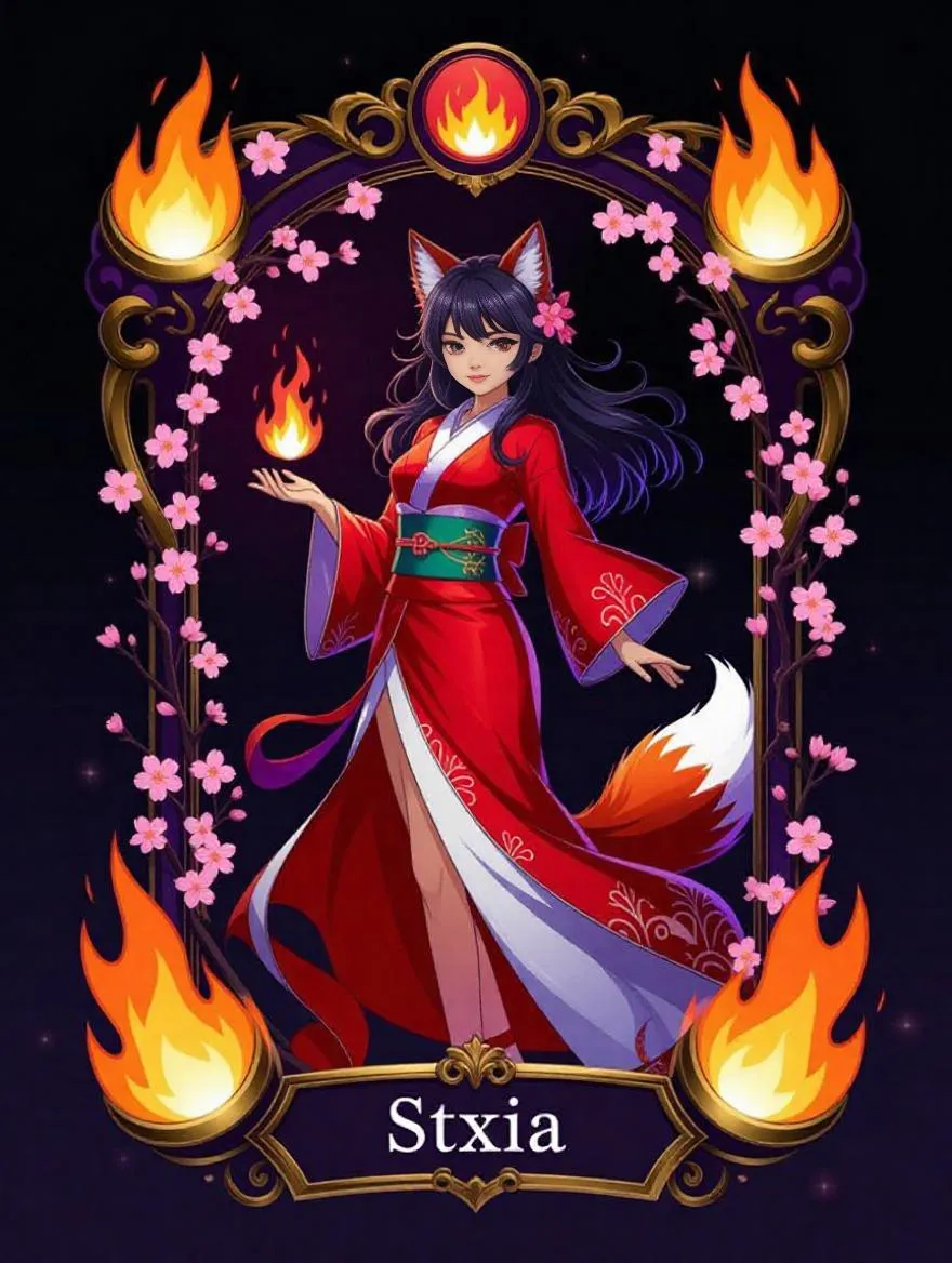 A vertical trading card illustration in anime style, featuring a fox girl character standing confidently inside an ornate fantasy card frame. The frame is adorned with glowing flames, cherry blossoms, and golden ornaments, with no text. The background glows with soft sparkles, enhancing the magical ambiance. The character is centered and posed dynamically, embodying her fire-element theme. The card has a high-detail, enchanted look, perfect for a game card. The fox girl wears a flowing red and white kimono, with long wavy dark hair and a red fox mask pushed to the side of her head. She holds a small floating flame in one hand, standing in an autumn forest. Her eyes are calm and powerful, surrounded by ember sparks. Fire-element vibes.
