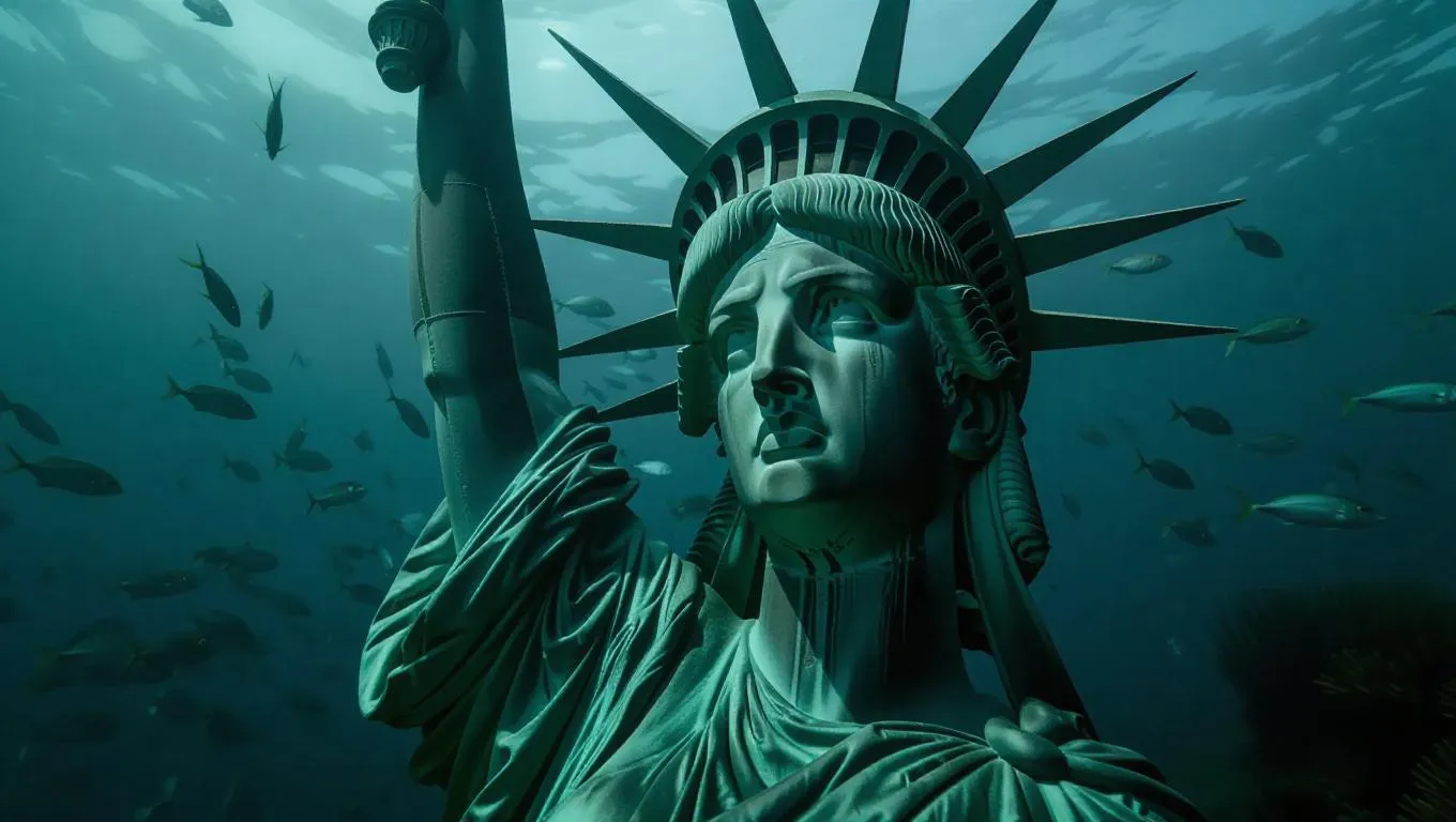 Rising from the dark, sandy ocean floor, a colossal, hyper-realistic Statue of Liberty bursts forth from the depths, her copper-green patina glistening with seawater droplets, as schools of iridescent fish dart past her majestic, stone-like face, while delicate seaweed tendrils sway in the gentle currents, surrounding her pedestal, a sunken, ancient temple-like structure overgrown with coral and anemones, in a breathtaking, wide-angle shot.