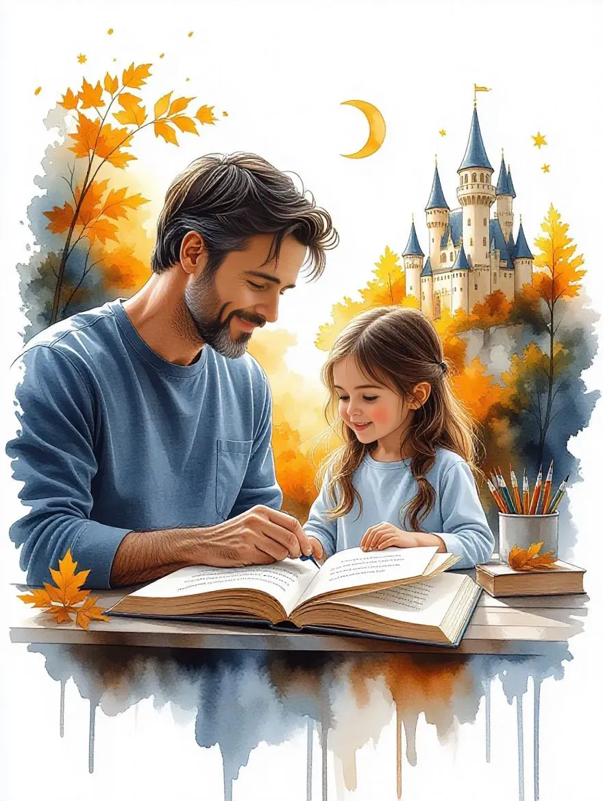 Discover the magic of storytelling with this warm watercolor scene. A parent and child create tales amidst whimsical castles, magical creatures, and adventure scenes in soft orange, blue, and gray hues. Delicate brushstrokes blend imagination and bonding, highlighting creativity's role in childhood development.