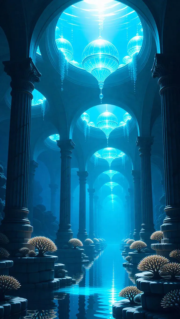 Deep beneath the ocean's surface, a breathtaking kingdom where crystal domes pierce the blue depths like frozen bubbles. Magical archways draped in flowing seaweed connect these grand structures, while bioluminescent coral casts an ethereal aqua glow. Golden sunbeams dance through the water, creating enchanting light patterns that illuminate the peaceful underwater sanctuary. Delicate pearl decorations adorn the architecture, reflecting light like stars in this dreamy realm where nature and fantasy blend in perfect harmony.